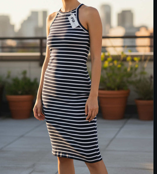 Striped Sleeveless Bodycon Midi Dress – Navy & White